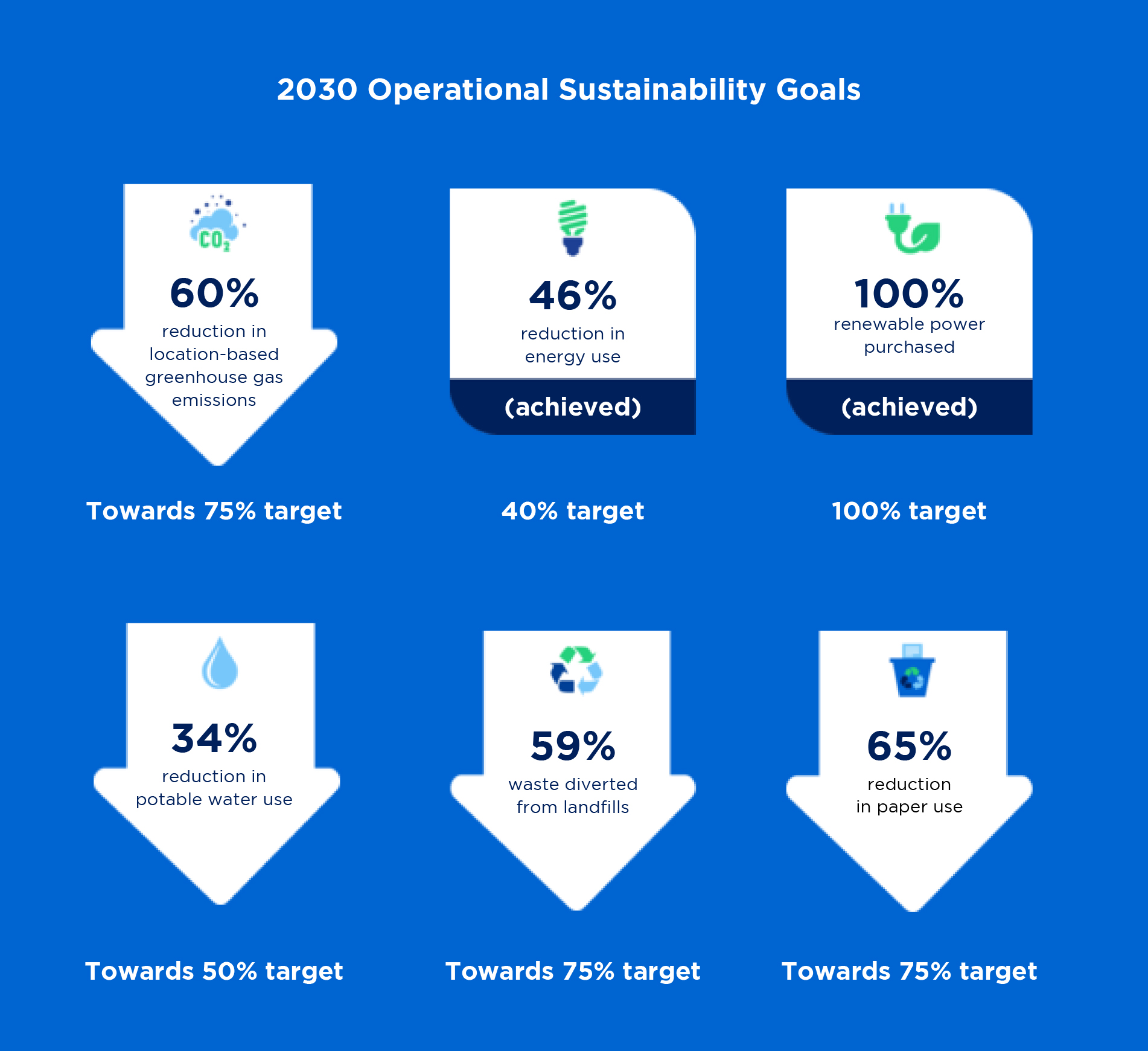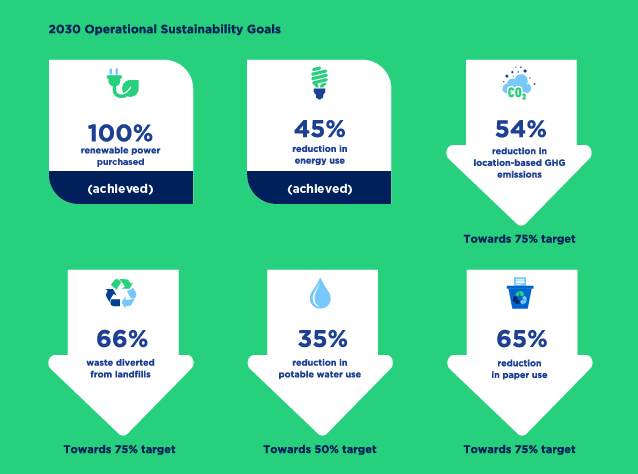 Operational sustainability, the reduction of our own environmental and carbon footprint, has been key to our environmental sustainability program since its inception in 2010. In addressing our own environmental impact, we better prepare our organization for future changes by reducing our exposure and risk to decarbonization, energy market volatility and potential carbon pricing scenarios.