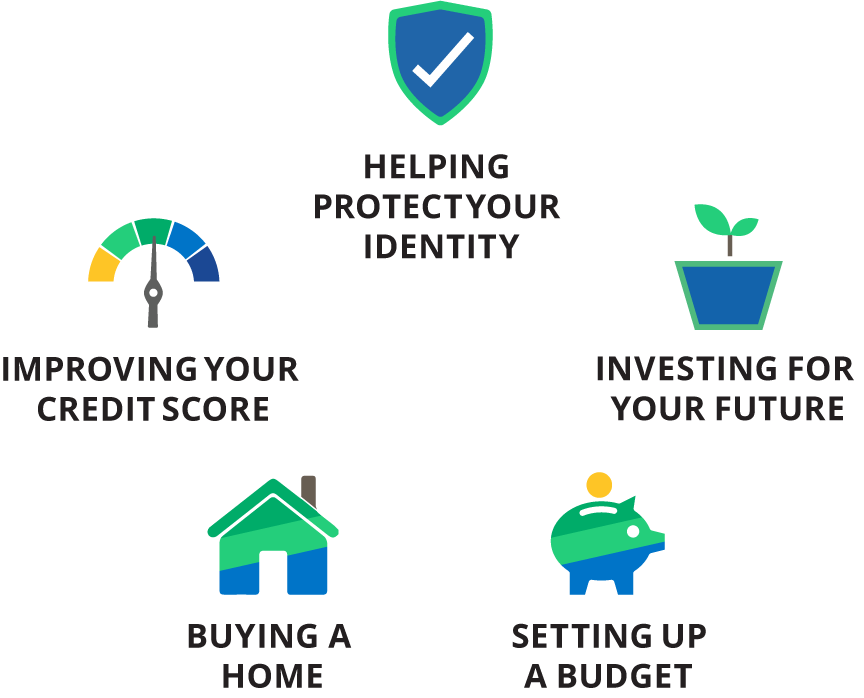 This diagram shows examples of ways in which Fifth Third can help you be better financially. Starting with helping to protect your identity, improving your credit score, buying a home, setting up a budget or investing in your future.